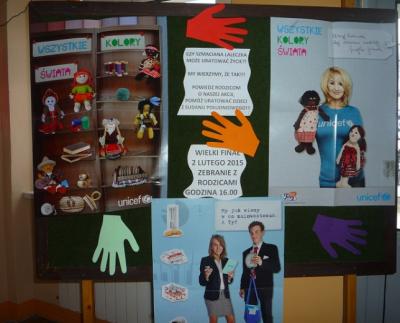 Projekt UNICEF był realizowany w naszym gimnazjum już po raz trzeci. Zawsze cieszy się ogromnym zainteresowaniem uczniów, a wcale nie ogranicza się tylko do eventu charyta-tywnego. Od listopada młodzież poznawała problemy Biednego Południa oraz działalność UNICEF metodą e-learningu. Kolejnym etapem było samodzielne przygotowanie scenariusza lekcji o Sudanie Południowym, znaczeniu szczepień w tym kraju z wykorzystaniem materiałów audiowizualnych. Uczestnicy projektu przeprowadzili na tej podstawie zajęcia w każdej klasie.-Projekt miał na celu nie tylko uwrażliwienie na potrzeby innych, kształtowanie tolerancji- podsumowuje Joanna Bykowska, szkolny koordynator akcji- Bardzo cenne okazało się rozwijanie w uczniach postaw otwartości, zaangażowania i kreatywnego rozwiązywania problemów. Niewątpliwą zaletą tego projektu była również współpraca międzypokoleniowa, gdyż w szyciu laleczek pomagali rodzice i dziadkowie.