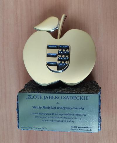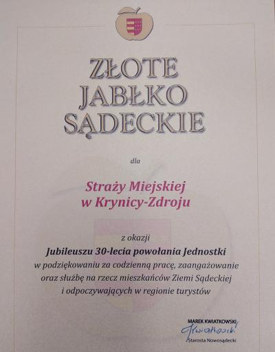 Ponadto, Straż Miejska w Krynicy Zdroju otrzymała statuetkę ZŁOTE JABŁKO SĄDECKIE przyznaną przez Starostę Nowosądeckiego Marka Kwiatkowskiego w podziękowaniu za codzienna prace, zaangażowanie oraz służbę na rzecz mieszkańców Ziemi Sądeckiej i odpoczywających w regionie turystów. Statuetkę wręczył wicestarosta Antoni Koszyk na ręce komendanta Piotra Szyszki.