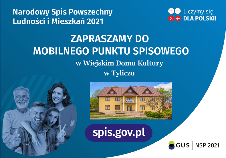 Szanowni Mieszkańcy! Każdy, kto do tej pory nie wypełnił obowiązku spisowego może przyjść, skorzystać z pomocy rachmistrza i spisać się w NSP 2021 w Wiejskim Domu Kultury w Tyliczu w każdy wtorek w godzinach od 9:00 do 11:00 oraz w każdą środę od 16:00
