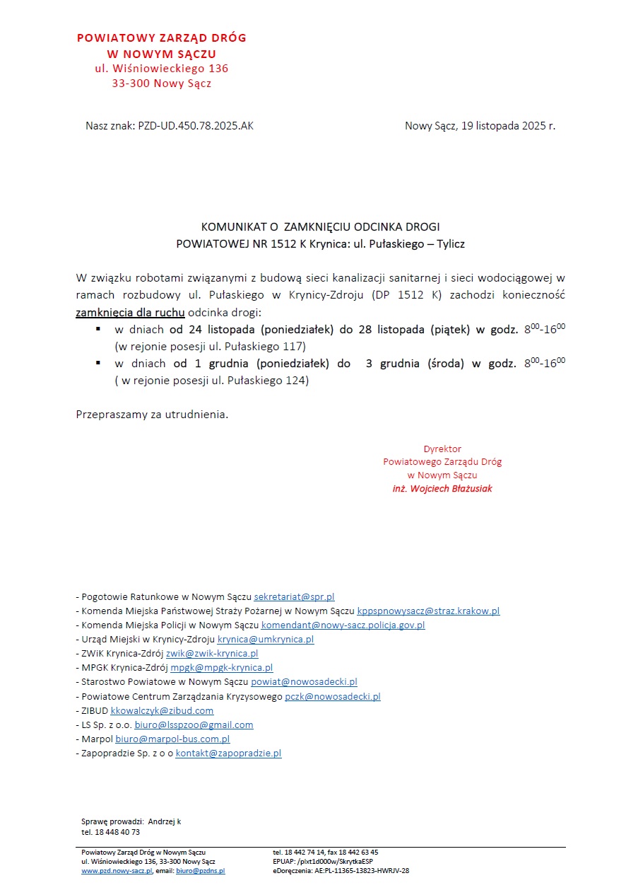 W związku robotami związanymi z budową sieci kanalizacji sanitarnej i sieci wodociągowej w ramach rozbudowy ul. Pułaskiego w Krynicy-Zdroju (DP 1512 K) zachodzi konieczność zamknięcia dla ruchu odcinka drogi: