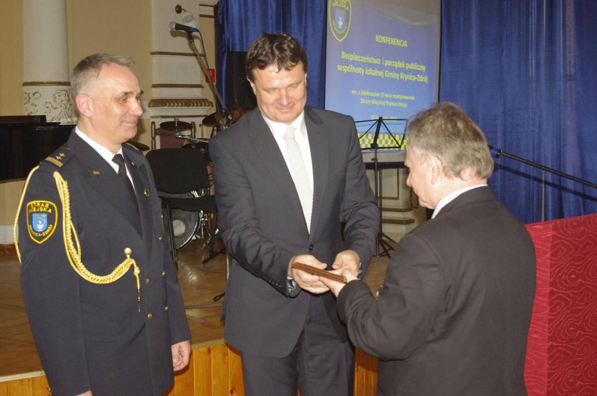 Obchody jubileuszu strażnicy i goście rozpoczęli Mszą św. w kościele zdrojowym, a następnie przemaszerowali za pocztem sztandarowym zaprzyjaźnionej Straży Miejskiej Miasta Krakowa do Sali Balowej Starego Domu Zdrojowego, gdzie odbyła się Konferencja „Bezpieczeństwo i porządek publiczny wspólnoty lokalnej Krynicy-Zdroju”. Po otwarciu Konferencji przez burmistrza Krynicy-Zdroju dra Dariusza Reśko, pierwsza cześć zawierała trzy wystąpienia. W pierwszym p. Artur Hałubiczko prefekt Krajowej Rady Komendantów Straży Miejskich i Gminnych RP, komendant Straży Miejskiej Częstochowy przedstawił krótką historię oraz dzisiejszą sytuacje straży miejskich w Polsce. Następnie, dr Jan Golba, burmistrz Muszyny zaprezentował na tle historycznym istotę i potrzebę funkcjonowania samorządowej formacji porządku publicznego, jaką jest obecnie straż miejska. Ostatni prelegent Piotr Szyszka, komendant Straży Miejskiej w krynicy-Zdroju przedstawił historię przedwojennej i współczesnej straży miejskiej oraz zadania jakie straż podejmuje na rzecz porządku publicznego dla dobra społeczności lokalne.