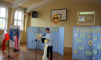 W uroczystości otwarcia udział wzięły przedstawicielki Fundacji: dr Mary Kay Pieski – Dyrektor Programu TEiP oraz dr Teresa Wojcik. Po wprowadzeniu flagi Polski i Stanów Zjednoczonych oraz odśpiewaniu hymnów obu krajów, amerykańską kadrę powitał Zastępca Burmistrza dr Tomasz Wołowiec. Organizacja Summer English Camp jest dla naszej Gminy dużym wyzwaniem, ale przede wszystkim ogromną szansą dla naszej młodzieży na wzmocnienie sprawności w zakresie języka angielskiego i okazją do poznania amerykańskiej kultury i obyczajowości – mówił Burmistrz. Wierzę, że tegoroczna edycja warsztatów języka angielskiego prowadzona we współpracy z Państwa Fundacją będzie początkiem wspaniałej i długoletniej kooperacji między nami.