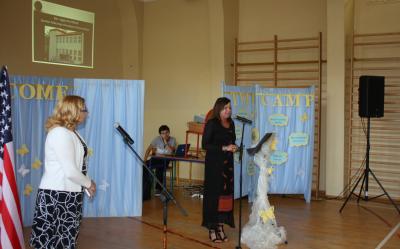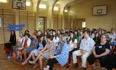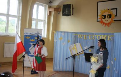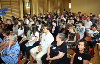 Burmistrz równocześnie złożył podziękowania pani dyrektor Agacie Król-Mirek za udostępnienie Publicznego Gimnazjum na potrzeby realizacji warsztatów językowych oraz dyrektorom gminnych szkół i kadrze polskich nauczycieli, którzy zaangażowali się w pomoc w przygotowaniu wakacyjnego obozu. Liderka kadry amerykańskiej Jacqueline Brown-Williams przedstawiła zespół swoich nauczycieli, którzy przez najbliższe dwa tygodnie będą pracować z krynicą młodzieżą. W czasie uroczystości dr Mary Kay Pieski zaprezentowała historię Fundacji Kościuszkowskiej, a młodzi uczestnicy warsztatów językowych samodzielnie powitali oficjalnie gości ze Stanów.
