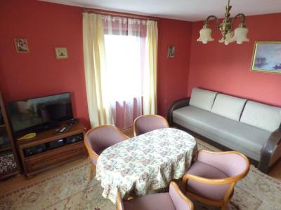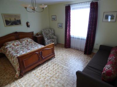 Dwa oddzielne pokoje, zapewniona pościel. Pokój „zielony”: łoże małżeńskie dwuosobowe, sofa dwuosobowa, szafa, fotel oraz głośnik bluetooth/FM. Pokój „czerwony”: łóżko/sofa dwuosobowa, sofa nierozkładana, TV 40”, Cyfrowy Polsat (pakiet podstawowy), wieża audio/DVD, stół, 4 krzesła, regał z książkami. |