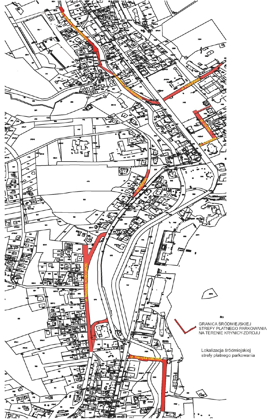 Ustala się następujący obszar śródmiejskiej strefy płatnego parkowania w Krynicy-Zdroju: